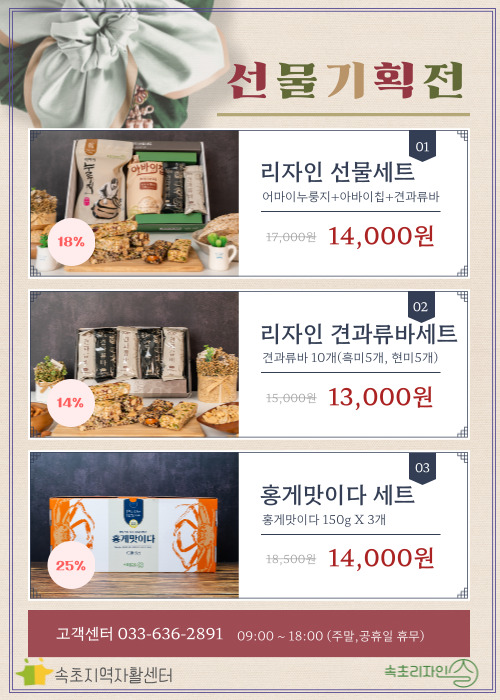 속초지역자활센터 설 명절 선물세트 판매합니다. 페이지 정보 작성자 관리자 댓글 0건 조회 305회 작성일 25-01-13 09:18 본문 다가오는 설 명절 속초지역자활센터 명절 선물세트와 함께 따뜻한 명절 보내세요^^ 첨부파일 주문 신청서 .hwpx (62.4K) 8회 다운로드 | DATE : 2025-01-13 09:46:01 목록 이전글속초지역자활센터 나따오비까 속초리자인 카페 자활전문가 채용 25.03.05 다음글무안공항 항공사고 희생자를 추모하며 삼가고인의 명복을 빕니다. 24.12.30 댓글목록 댓글목록 등록된 댓글이 없습니다.